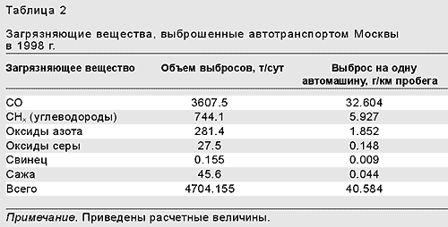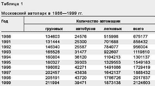 Автомобиль не роскошь, а средство передвижения, говорил небезызвестный читателю Остап Бендер. Количество этих средств увеличивается повсюду, не составляет исключения и Москва. К январю 2001 г. московский автопарк насчитывал около 3 млн единиц, что составляло ~10% от всех автомашин Российской Федерации. По сравнению с 1996 г. общее число автомобилей в Москве увеличилось примерно в четыре раза, причем количество легковых машин выросло больше, чем грузовых и автобусов (табл.1). Виды топлива остались теми же, но больше всего потреблялось бензина (70%), на долю дизельного топлива приходилось примерно 29%, а газа — всего около 1%.