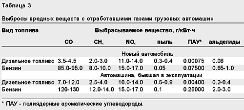 Состав и свойства токсичных веществ, поступающих в атмосферу города с выхлопными газами, существенно зависят не только от вида топлива, но и от типа, модели, технических параметров автомашин, в том числе от степени их изношенности (табл.3).