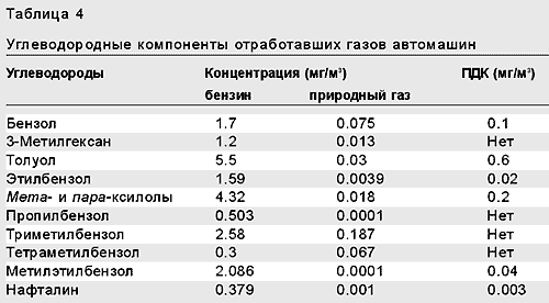 где n составляет 5—10 для бензинов и 13—25 для дизельного топлива. В действительности же продуктов сгорания в выхлопных газах гораздо больше (табл.2). Причина этого — неравновесные условия горения топлива, присутствие в нем разных примесей (в том числе органических производных азота и серы), остающихся при перегонке нефти, а также добавление в качестве антидетонатора тетраметил- и тетраэтилсвинца.