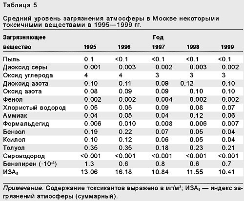 В настоящее время вклад автомобильного транспорта в загрязнение атмосферного воздуха мегаполисов очень велик: в Санкт-Петербурге в 1997 г. он равнялся 78%, а в Москве в последние годы — от 85 до 90%. Выбросы всего московского автопарка вместе с выбросами других источников и составляют общий уровень загрязнения. В последние годы, как следует из данных Московского центра по гидрометеорологии и мониторингу окружающей среды, средний уровень оставался довольно высоким (табл.5).
