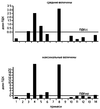 Средние и максимальные концентрации вредных примесей в воздухе Москвы. 1 — пыль, 2 — диоксид серы, 3 — оксид углерода, 4 — диоксид азота, 5 — оксид азота, 6 — фенол, 7 — хлористый водород, 8 — аммиак, 9 — формальдегид, 10 — бензол, 11 — ксилол, 12 — толуол, 13 — сероводород, 14 — бензпирен. ПДКсс и ПДКмр — соответственно среднесуточные и максимально разовые предельно допустимые концентрации.
