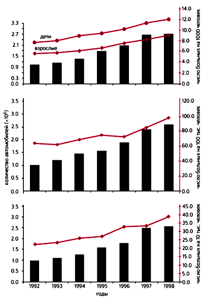 Увеличение автопарка (показано столбиками ) и заболеваемость (кривые ) населения в Москве.