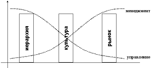 В реальных хозяйственных и социальных системах эти инструменты всегда сосуществуют. Речь идет лишь о том, чему отдается приоритет, какой инструмент играет определяющую роль. На рисунке 1 в очень схематичной форме дано представление о соотношении понятий “управление” и “менеджмент”. Если предпочтение отдается иерархии (как, например, в административно-командной системе советского общества или в армии, или в государственных органах), то речь идет об управлении, напротив, если, в основном, используются рыночные инструменты, то можно говорить о менеджменте. Культура – весьма эффективный, но наиболее “инерционный” инструмент управления. По мнению экспертов, реформирование современного российского общества весьма затруднено, в частности, из-за невозможности быстрых изменений в социо-культурной и нравственно-этической областях.