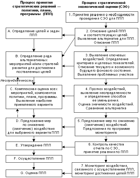 Отметим, что в нормативно-технических и законодательных актах РФ понятийный аппарат в области оценки воздействия на окружающую среду и экологической экспертизы в настоящее время представлен четко и однозначно [15]. Однако, в работах, посвященных развитию территориальных комплексных схем охраны природы (в том числе, созданию особо охраняемых природных территорий) [16] термины “экологическая” и “эколого-географическая экспертиза” используются в значении, близком к приведенному в словарях русского языка: рассмотрение, исследование вопросов, решение которых требует специальных знаний в области науки, техники и т.п. Терминологическая неточность является следствием (а в ряде случаев и приводит к) неадекватной оценки целей, задач, возможностей экологической оценки; такие этапы, как выявление альтернатив предлагаемых планов и программ, ключевых воздействий (а также критериев их ранжирования), прогноз воздействий, выявление неопределенности, предложение мер по снижению воздействий остаются непроработанными. Фактически, в традиционной форме государственной экологической экспертизы соблюдается лишь позиция “Контроль качества отчета по стратегической экологической оценке” (рис. 2, [14]), хотя сами документы, строго говоря, не являются отчетами по стратегической экологической оценке.