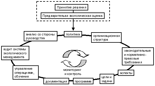Центральную позицию в методологии добровольной экологической деятельности занимает система экологического менеджмента – часть общей системы менеджмента, включающая организационную структуру, планирование деятельности, распределение ответственности, практическую работу, а также процедуры, процессы и ресурсы для разработки, внедрения, оценки достигнутых результатов реализации и совершенствования экологической политики, целей и задач [23]. В качестве основного (и единственного строгого) требования выступает требование обоснованной демонстрации поэтапного улучшения как процесса развития системы экологического менеджмента, направленного на достижение лучших показателей во всех экологических аспектах6 деятельности предприятия, там, где это практически достижимо в соответствии с его экологической политикой. Система экологического менеджмента дает организации возможность структурировать, связать воедино процессы, направленные на достижение последовательного улучшения, желаемая степень которого определяется самой организацией в зависимости от экономических и иных обстоятельств.