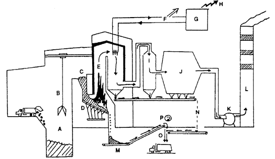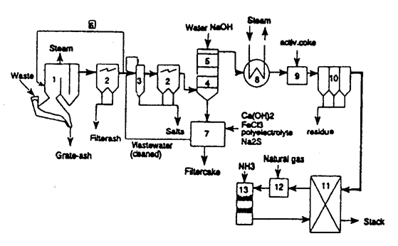 Рис.1. Типичная схема современного мусоросжигательного завода с рекуперацией энергии и очисткой отходящих газов.