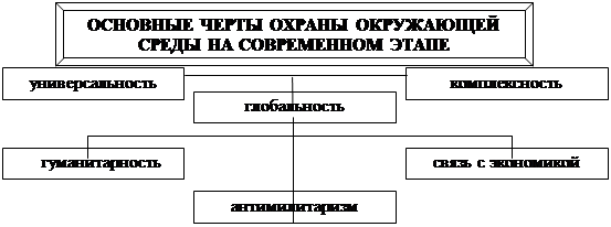 Для характеристики современного этапа развития проблемы охраны окружающей природной среды отметим такие важные направления. Первое — гуманизация охраны окружающей среды. В центре внимания охраны окружающей природной среды становится человек, его жизнь и здоровье, его благосостояние, его генетическая программа. Через призму охраны прежде всего здоровья человека решаются проблемы охраны всей окружающей природной среды (в отличие от охраны природы, когда человек, его здоровье, охранялись как результат защиты всей экологической цепочки, в конце которой находился человек).