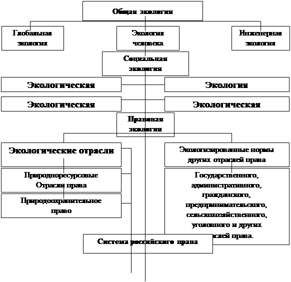 Вся система экологических наук подразделяется условно на две крупные части (см. табл.). Это — общая экология и социальная экология. В социальной экологии наряду с экономикой, урбанистикой и тому подобными отраслями выделяется правовая экология как совокупность норм, регулирующих общественные отношения в области взаимоотношений человека и природной среды. Правовая экология как совокупность норм, в свою очередь, состоит из нескольких частей. Во-первых, экологические отрасли права: природноресурсовые права и природоохранительное право. Во-вторых, сюда относятся и те нормы советского права, которые регулируют земельные, хозяйственные, финансовые, административные и т.п. отношения с учетом конкретных экологических требований. Такие «экологизированные» нормы, размещенные в других отраслях права, входят в состав правовой экологии.