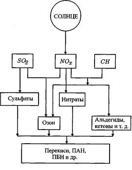 3) оксиды азота (~ 98% NО,~ 2% NO2 ), которые по мере пребывания в атмосфере соединяются с кислородом;