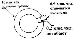 Движение материи обеспечивает транспорт. Развитие транспорта порождает проблемы. Ежегодно в мире в автокатастрофах погибают 0,2 млн. человек, 0,5 млн. становятся калеками, 10 млн. получают травмы (рис.1.4.8.). По использованию площадей в мире по крайней мере треть площади города приходится на дороги и автостоянки. Строительство дорог в большей степени стимулирует увеличение транспортных потоков и, как следствие, снижение средней скорости перемещения.