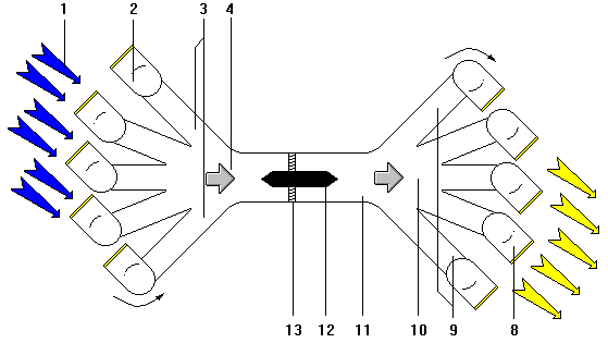 Цифрами обозначены: 1 - направление ветра; 2 - воздухозаборное устройство; 3 - входные воздуховоды; 4 - конфузор; 5 - серводвигатель поворота; 6 - поворотный круг; 7 - диаметр ВУ; в - устройство сброса; 9 - отводящие воздуховоды; 10 -диффузор; 11 - рабочий канал; 12 - электрогенератор, 13 - турбина.