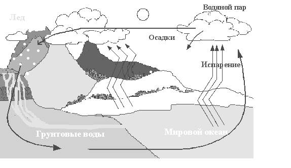 Круговорот воды является одним из грандиозных процессов на поверхности земного шара. Он играет главную роль в связывании геологического и биотического круговоротов. В биосфере вода, непрерывно переходя из одного состояния в другое, совершает малый и большой круговороты. Испарение воды с поверхности океана, конденсация водяного пара в атмосфере и выпадение осадков на поверхность океана образуют малый круговорот. Если же водяной пар переносится воздушными течениями на сушу, круговорот становится значительно сложнее. В этом случае часть осадков испаряется и поступает обратно в атмосферу, другая - питает реки и водоемы, но в итоге вновь возвращается в океан речным и подземным стоком, завершая тем самым большой круговорот. Важное свойство круговорота воды заключается в том, что он, взаимодействуя с литосферой, атмосферой и живым веществом, связывает воедино все части гидросферы: океан, реки, почвенную влагу, подземные воды и атмосферную влагу. Вода - важнейший компонент всего живого. Грунтовые воды, проникая сквозь ткани растения в процессе транспирации, привносят минеральные соли, необходимые для жизнедеятельности самих растений.