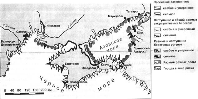 Крайне интенсивными могут быть изменения на хорошо освоенных берегах, например — Черного и Азовского морей, где естественное развитие будет сочетаться с интенсивным антропогенным воздействием, т.е. изъятием наносов с пляжей, строительством дамб и плотин на реках, созданием берегозащитных сооружений и т.д. Наиболее интенсивно будут разрушаться песчаные пересыпи, отчленяющие лиманы в Северо-Западном Причерноморье и на Азовском море, а также косы Северного Приазовья. В дельте Кубани и на Перекопском перешейке ожидается затопление прибрежных низменностей. Быстрее станут отступать береговые склоны, сложенные непрочными лессами. В районе Одессы, Мариуполя, Приморско-Ахтарска помимо размыва уступов усилятся оползневые и обвальные процессы, и разрушение берегов может достичь катастрофических масштабов.