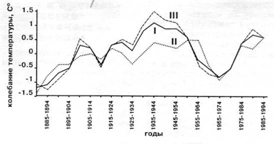 Временный ход среднегодовой ( I ), среднелетний ( II ) и среднезимней ( III ) температуры воздуха в Салехарде (север Западной Сибири). Приведены усредненные по 10-летним интервалам отклонения температуры от среднего значения за весь период наблюдений (ноль на вертикальной шкале)