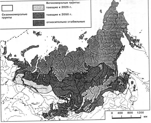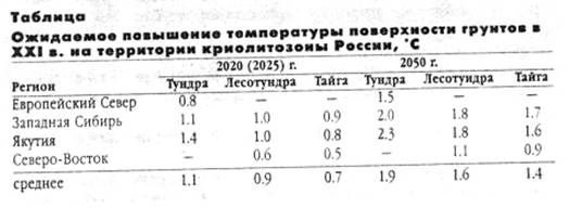 Если оправдаются приведенные выше прогнозные оценки умеренного (а тем более резкого) потепления климата в северных районах, то к середине нового столетия облик вечной мерзлоты в России существенно изменится.