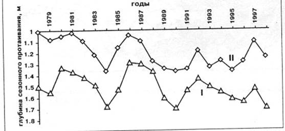 Вариации глубины максимального сезонного протаивания грунтов на стационаре Маре-Сале за 1978-1998гг. Эксперементальные площадки: I – полигональная тундра, II – песчаный раздув на участке полигональной тундры.