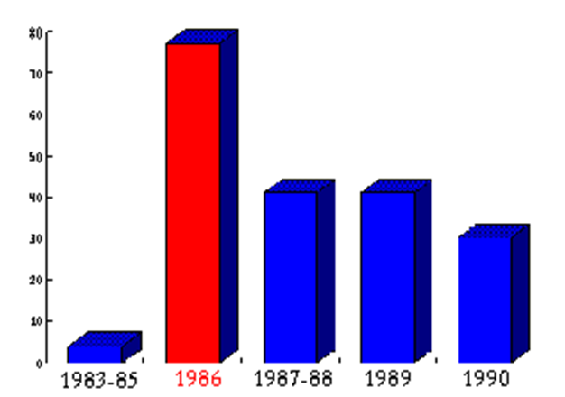 В течение первых 1,5 лет после аварии нами не было отмечено увеличения частоты осложнений беременности и родов, перинатальной смертности, регистрируемых аномалий развития, соматической заболеваемости беременных и заболеваемости новорожденных. Но со второй половины 1988 г. начался существенный рост таких осложнений беременности, как поздние гестозы, угроза прерывания, преждевременные роды, и к 1995 году частота их в 2–3 раза превысила доаварийный уровень (рис. 6). Это может быть связано с влиянием не только прямых последствий аварии, но и ряда других факторов, в том числе изменением условий быта, уклада жизни, нарушением характера питания, особенно в тех населенных пунктах пострадавших районов, где запрещено употребление местных продуктов.