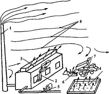 1 — высокая дымовая труба; 2 — низкая дымовая труба; 3 — аэрационный фонарь цеха; 4 — испарения с поверхности бассейна; 5 — утечки через неплотности оборудования; 6 — пыление при разгрузке сыпучих материалов; 7 — выхлопная труба автомобиля; 8 — направление движения потоков воздуха.