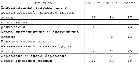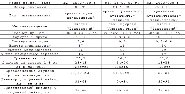 Таблица 3. Данные по пробным площадам, отбитым в лиственничниках (1999-2000 г.г.)