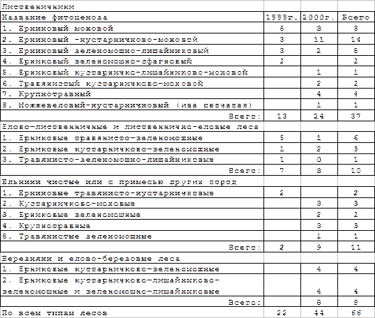 Таблица 2. Различные лесные фитоценозы, описанные в 1999-2000 г.г. в бассейне верхней Лемвы.