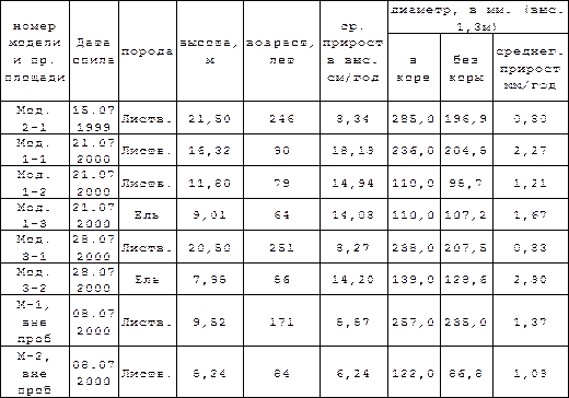Всего за два года было отбито 5 пробных площадей; из них 3 в лиственничниках, две в ельниках. Размеры пробных площадей 20х25 и 25х40 метров (0,05 и 0,1 га соответственно) Для маркировки сторон пробных площадей использовался волчатник – толстая рыболовная леска с привязанными через каждые 40-50 см флажками красного цвета. Разметка сторон, ориентированных по направлениям север-юг и запад-восток производилась с помощью жидкостного компаса и рулеток длинной 30 и 50 м. При малой сомкнутости крон сама разметка трудностей не составляла: невязка никогда не превышала 0,3-0,5 м. Азимуты брались магнитные, без поправки на магнитное склонение (+220 ). Пересчет производился по частям пробной площади, разделенной тем же волчатником и рулетками. Измерялись все живые деревья, сухостой, валеж и подрост. У деревьев замеру подлежали диаметр на высоте 1,3 м и у корневой шейки. Высоты оценивались глазомерно; после спила модельных деревьев оценки сопоставлялись с действительной высотой. Ошибки при оценке высоты были не более 0,5м. На пробных площадях, отбитых в 2000 году, делались почвенные разрезы и брались образцы почв. Делалось детальное геоботаническое описанией, в гребарий брались неизвестные и трудноопределяемые виды (злаки, осоки, ивы, астровые и др.) Взяты, но пока не определны, мхи и лишайники.