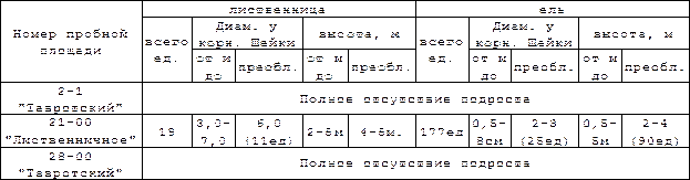 Таблица 5. Учет подроста по пробным площадям в лиственичниках.
