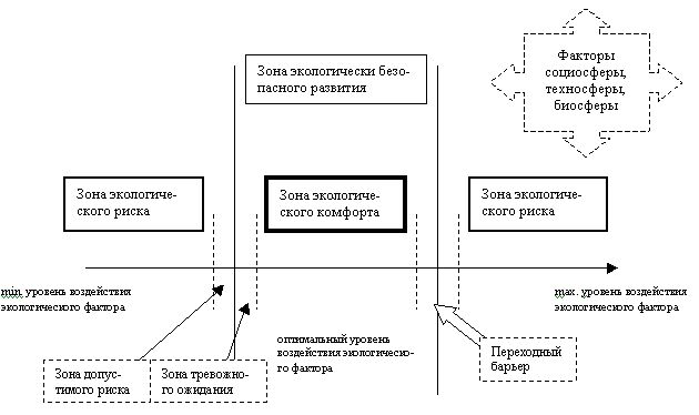 Рассмотрим приведенную диаграмму. Наибольший интерес для нас здесь представляют т.н. переходные барьеры, так как именно они отделяют состояние экологически безопасного развития (зону экологического комфорта) от состояния экологического риска. Эти барьеры имеют более сложное строение. С внутренней стороны существует зона тревожного ожидания (когда мы все еще находимся в состоянии экологического комфорта, но уже появляется риск перехода к неблагоприятной ситуации - экологический риск). С внешней стороны существует зона допустимого риска (пока еще экологический фактор не оказывает критического воздействие на здоровье человека/ состояние экосистемы. Предельные значения интенсивности экологического фактора означают экологическую катастрофу, приводящую к гибели человека/ разрушению экосистемы.