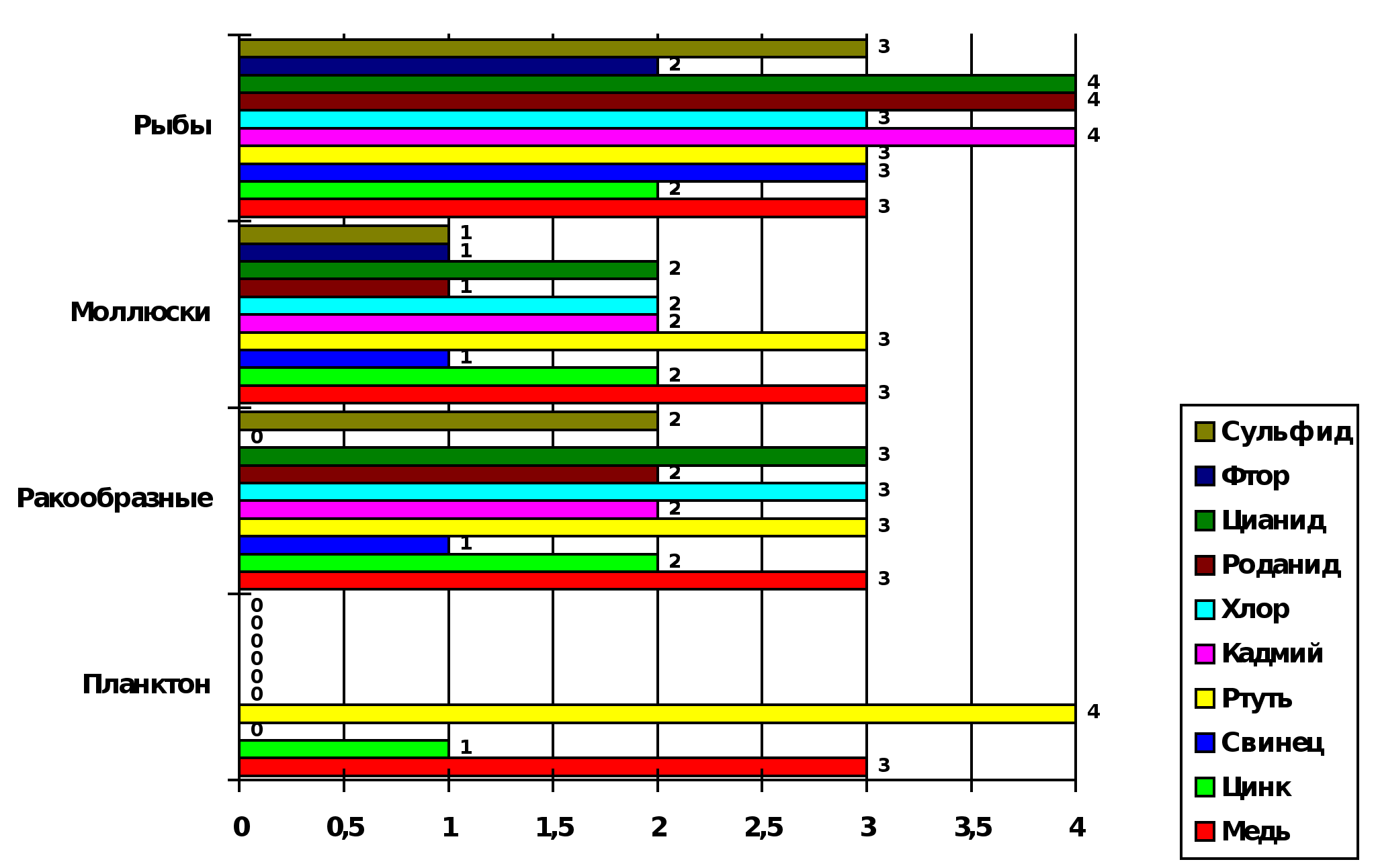 Основными неорганическими (минеральными) загрязнителями пресных и морских вод являются разнообразные химические соединения, токсичные для обитателей водной среды. Это соединения мышьяка, свинца, кадмия, ртути, хрома, меди, фтора, а также цианидные соединения. Большинство из них попадает в воду в результате человеческой деятельности. Тяжелые металлы поглощаются фитопланктоном, а затем передаются по пищевой цепи более высокоорганизованным организмам. Токсический эффект некоторых наиболее распространенных загрязнителей гидросферы представлен на рисунке 1: