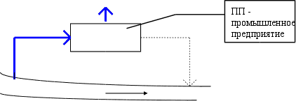 Можно выделить 2 основных системы водообеспечения промышленных предприятий: прямоточная и последовательная система. При прямоточной системе (рис. 2) вся забираемая из водоема вода Qист после участия в технологическом процессе (в виде отработавшей – Qсбр) возвращается в водоем, за исключением того количества воды, которое безвозвратно расходуется в производстве (Qпот).