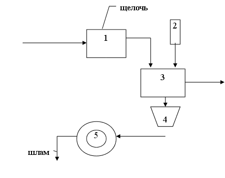 Сточные воды подпадают в нейтрализатор 1, для образования нерастворимых гидроксидов. После нейтрализации стоки направляются в отстойник 3, куда подается флокулянт. Из отстойника шлам попадает в шламонакопитель 4, откуда подается на обезвоживание 5. Обезвоживание проводится в вакуум-фильтрах, фильтр-прессах и центрифугах.