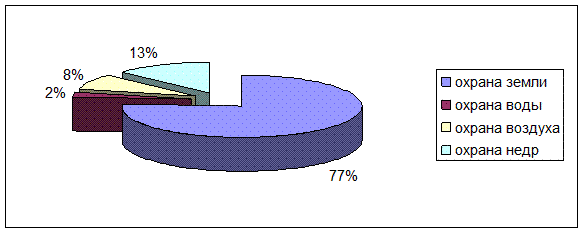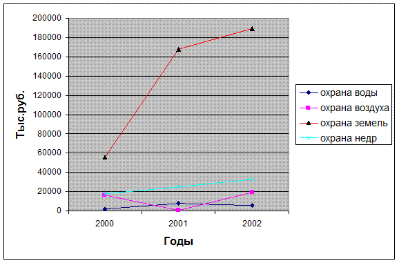 Во второй главе был произведен анализ показателей природоохранной деятельности в динамике за 2000-2002 годы. Вследствие загрязнения земель и дальнейшей их рекультивации, внесения различных удобрений, ремонта трубопроводов большая доля затрат (77%) приходится на мероприятия по охране земель. Сравнительно небольшие затраты приходятся на мероприятия по охране атмосферного воздуха и охране водных ресурсов. Также с каждым годом наблюдается положительная тенденция увеличения затрат на мероприятия по охране земель и охране недр.