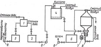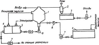 1- циклонный разделитель; 2—сборник сточной воды; 3 — сборник масла; 4—смеситель-нейтрализатор; 5— колонный электрокоагулятор; б—сборник отходов;7—источник питания; 8 — насосы