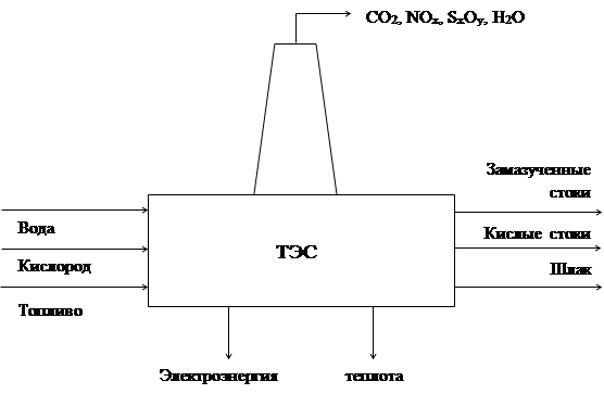 станций. ТЭС преобразуют энергию топлива, образующуюся при его горении, в электрическую; причем в процессе горения часть теплоты и продукты горения выбрасываются в окружающую среду. Если ТЭС работает на мазуте, то до горения его смешивают с паром и распыляют в горелках, где он не весь реагирует: так появляются замазученные стоки, которые сливаются в окружающую среду. Технология ТЭС требует очистки воды, причем используется