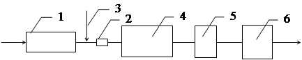 1-сборник-усреднитель для удаления осевших и всплывших нефтепродуктов; 2- эжектор для засасывания воздуха и насыщения им воды; 3- дозатор реагентов- сернокислого алюминия и щелочи; 4- флотатор; 5- механический фильтр; 6- сорбционный фильтр с активированным углем.
