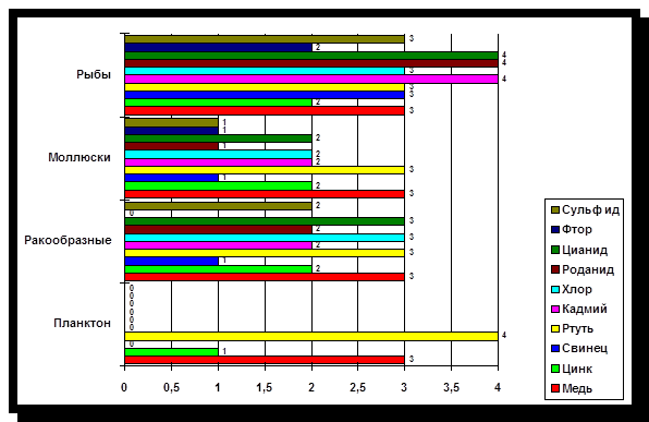 Основными неорганическими (минеральными) загрязнителями пресных и морских вод являются разнообразные химические соединения, токсичные для обитателей водной среды. Это соединения мышьяка, свинца, кадмия, ртути, хрома, меди, фтора. Большинство из них попадает в воду в результате человеческой деятельности. Тяжелые металлы поглощаются фитопланктоном, а затем передаются по пищевой цепи более высокоорганизованным организмам. Токсический эффект некоторых наиболее распространенных загрязнителей гидросферы представлен на рисунке 2: