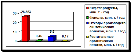 Среди вносимых в океан с суши растворимых веществ, большое значение для обитателей водной среды имеют не только минеральные, биогенные элементы, но и органические остатки.Вынос в океан органического вещества оценивается в 300 - 380 млн.т./год.Сточные воды, содержащие суспензии органического происхождения или растворенное органическое вещество, пагубно влияют на состояние водоемов.Осаждаясь, суспензии заливают дно и задерживают развитие или полностью прекращают жизнедеятельность данных микроорганизмов, участвующих в процессе самоочищения вод. При гниении данных осадков могут образовываться вредные соединения и отравляющие вещества, такие как сероводород, которые приводят к загрязнению всей воды в реке. Наличие суспензий затрудняют также проникновение света в глубь воды и замедляет процессы фотосинтеза. Одним из основных санитарных требований, предъявляемых к качеству воды, является содержание в ней необходимого количества кислорода. Вредное действие оказывают все загрязнения, которые так или иначе содействуют снижению содержания кислорода в воде.Поверхностноактивные вещества - жиры, масла, смазочные материалы- образуют на поверхности воды пленку, которая препятствует газообмену между водой и атмосферой, что снижает степень насыщенности воды кислородом. Значительный объем органических веществ, большинство из которых не свойственно природным водам, сбрасывается в реки вместе с промышленными и бытовыми стоками. Нарастающее загрязнение водоемов и водостоков наблюдается во всех промышленных странах. Информация о содержании некоторых органических веществ в промышленных сточных водах предоставлена на рисунке 3 .