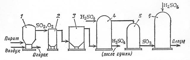 1-печь для обжига; 2,3-пылеулавливатели; 4-осушительная башня; 5-контактный аппарат; 6-поглотительная башня.