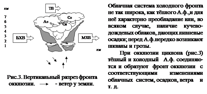 Перемещаясь, Ц. способствует переносу тёплого воздуха в передней (восточной) части к высоким широтам и холодного воздуха в тыловой части (западной) к низким широтам. В южной части Ц. в нижних слоях создаётся тёплый сектор, ограниченный тёплым и холодным фронтами (стадия молодого Ц.),(рис.5). В последующем, при смыкании холодного и тёплого фронтов (окклюзия Ц.) происходящего вследствие большей скорости холодного фронта нежели тёплого он всегда догоняет последний, смешиваясь, они образуют сложный фронт именуемый фронтом окклюзии