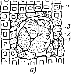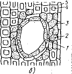 Рис. 2. Вертикальные смоляные ходы на поперечном разрезе древесины сосны: а — освобожденные от смолы, б — заполненные смолой; 1 — выстилающие клетки, 2 — мертвые клетки, 3 — клетки сопровождающей паренхимы, 4 -трахеиды, 5 — сердцевинные лучи