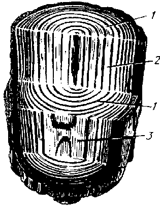 Рис. 7. Главные разрезы ствола: 1 — поперечный, или торцовый, 2 — радиальный, 3 — тангенциальный