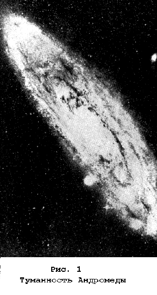 Кант утверждал, что, если бы “светящиеся пятна” представляли собой звезды гиганских размеров, их поверхносная яркость была бы гораздо больше наблюдаемой. Менее чем через 100 лет английский любитель астрономии Уильям Хаггинс сконструировал первый спектроскоп, пригодный для астрономических наблюдений, и использовал его для систематического изучения звезд и туманностей. Он обнаружил, что спиральные туманности, которые Кант отождествлял с далекими звездными системами, имеют, как предсказывал Кант, непрерывный спектр, подобный спектру обычных звезд. Спектры туманностей, которые выглядели как однородные и бесструктурные пятна даже при наблюдении в более мощные телескопы, наоборот, состояли из отдельных узких и ярких линий. Это были истинные туманности - протяженные облака горячего газа. В соответсвии с этим туманности разделяются на внегалактические (туманость Андромеды (рис.1)) и галактические - облака газа и пыли.