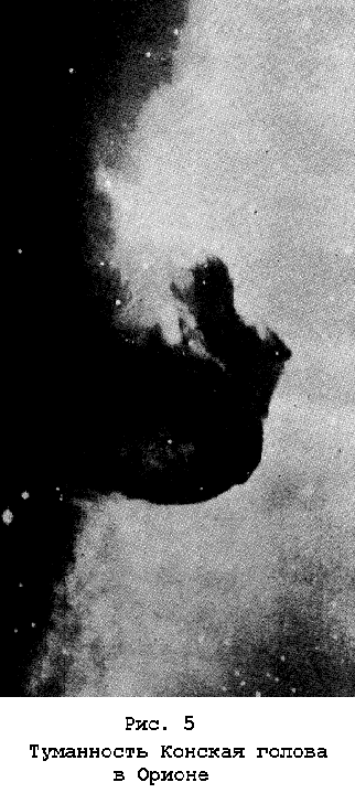 Барнард создал каталог темных облаков. Он подтвердил ранее подмеченное обстоятельство, что темные туманности имеют сильную тенденцию располагаться вдоль галактического экватора (пересечение плоскости Галактики и небесной сферы). Примером темных облаков служит туманность Конская голова в Орионе (Рис. 5).