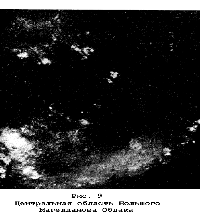 Бросающейся в глаза особенностью эмиссионных туманностей (туманность Ориона (Рис. 4) и Трехраздельная туманность (Рис. 7) принадлежат этому типу) является множество ярких эмиссионных линий в их спектрах. Эти спектральные линии являются как бы опознавательными “ярлыками”. Именно эти линии и привели к открытию туманностей во всех частях Млечного Пути и даже в далеких галактиках. Наилучшим образцом эмиссионной туманности может служить туманность Тарантул в Большом Магеллановом Облаке (Рис. 9). Туманности в Малом Магеллановом Облаке менее яркие и менее заметные (Рис. 11). Эмиссионная туманность излучает свет, характерный для вещества, из которого она состоит, если ее подходящим образом освещает звезда. Мы можем себе представить звезды как гигантские фонари, которые освещают смесь флуоресци-рующего вещества (атомы) и отражающих свет частиц (пыль). Непрерывные спектры эмиссион-ных туманностей, по-видимому, образуются не только вследствие отражения света от пылинок, но также в результате эмиссионных процессов, в которых принимают участие тяжелые атомы. Если свет “фонаря” богат ультрафиолетом, газ флуоресцирует и появляются яркие линии. Но когда присутствуют лишь сравнительно холодные звезды, то нет того изобилия ультрафиолетовой радиации, которую атом может поглощать и излучать заново в форме видимых ярких линий.