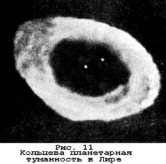 Планетарные туманности выглядят как маленькие, слабо святящиеся диски или кольца, слегка напоминающие диски планеты. Планетарные туманности состоят из газа, но они не являются ни планетами, ни настоящими туманностями, так что вряд ли можно было бы придумать для них менее удачное название, чем это общепринятое. Наиболее известна Кольцевая туманность в созвездии Лиры (Рис. 11), открытая в 1779 году. Она состоит из центральной звезды, окруженной газовой оболочкой. При детальном рассмотрении стано-вится заметно, что на краях сосредоточено больше светящегося вещества, чем в центре, поэтому туманность выглядит как кольцо. Все планетарные туманности расширяются. Их возраст вряд ли может превышать несколько десятков тысяч лет, по имеющимся оценкам; если газовая оболочка сбрасывается старой звездой (а это, вероятно, так), вещество оболочки не может продолжать светиться много дольше ста тысяч лет или около того. По одной из теорий планетарные туманности порождаются звездами - красными гигантами, сбрасывающими в пространство свои внешние слои, так что центральные звезды планетарных туманностей представляют собой ядро красных гигантов. Идея сброса оболочки хорошо согласуется с предполагаемой эволюционной последователь-ностью, хотя отнюдь нельзя с уверенностью считать, что каждая нормальная звезда неизбежно порождает планетарную туманность на поздних этапах своей жизни.