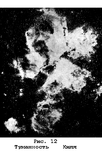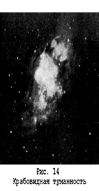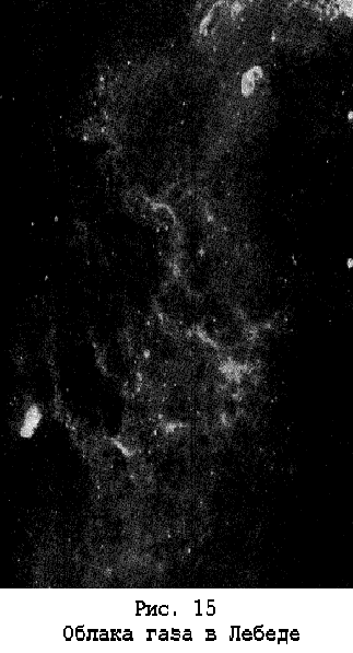 Существуют, наконец, туманности, представляющие собой конечный продукт звездной эволюции. Среди них наиболее известна Крабовидная туманность (Рис.14). Почти все прочие объекты такого типа имеют значительно больший возраст, и поэтому их особенности не так отчетливо выражены. В любом случае Крабовидная туманность - с необычайным пульсаром в центре - представ-ляется исключительным объектом. У волокнистой туманности Лебедя (Рис. 15) хорошо заметна дугообразная форма светящегося вещества; все говорит о том, что это - остаток взрыва сверхновой, происшедшего в доисторические времена.