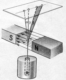 канала находится фотопластинка. На выходящее из канала излучение действует сильное магнитное поле, линии индукции которого перпендикулярны лучу. Вся установка размещается в вакууме. Под действием магнитного поля пучок распадается на три пучка. Две составляющие первичного потока отклоняются в противоположные стороны. Это указывает на наличие у этих излучений электрических зарядов противоположных знаков. При этом отрицательный компонент излучения отклоняется магнитным полем гораздо сильнее, чем положительный. Третья составляющая не отклоняется магнитным полем. Положительно заряженный компонент получил название альфа-лучей, отрицательно заряженный – бетта-лучей и нейтральный – гамма-лучей.