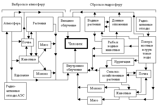 Среди техногенных радионуклидов особого внимания заслуживают изотопы йода (131 I, 132 I). Они обладают высокой химической активностью, способны интенсивно включаться в биологический круговорот и мигрировать по биологическим цепям, одним из звеньев которых может быть человек. Основным начальным звеном многих пищевых цепей является загрязнение поверхности почвы и растений. Продукты питания животного происхождения - один из основных источников попадания радионуклидов к человеку. Исследования, охватившие примерно 100000 человек, переживших атомные бомбардировки Хиросимы и Нагасаки, показывают, что рак - наиболее серьезное последствие облучения человека при малых дозах. Первыми среди раковых заболеваний, поражающих население, стоят лейкозы. Распространенными видами рака под действием радиации являются рак молочной железы и рак щитовидной железы. Обе эти разновидности рака излечимы и оценки ООН показывают, что в случае рака щитовидной железы летальный исход наблюдается у одного человека из тысячи, облученных при индивидуальной поглощенной дозе 1 Грей. (1 Гр = 1 Дж/кг)