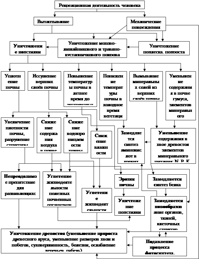 Присутствие даже одного человека не проходит для леса бесследно. Сбор грибов, цветов и ягод подрывает самовозобновление ряда видов растений. Костёр на 5-7 лет полностью выводит из строя клочок земли, на котором он был разложен. Шум отпугивает различных птиц и млекопитающих, мешает им нормально растить потомство. Обламывание ветвей, зарубки на стволах и другие механические повреждения деревьев способствуют заражению их насекомыми-вредителями.