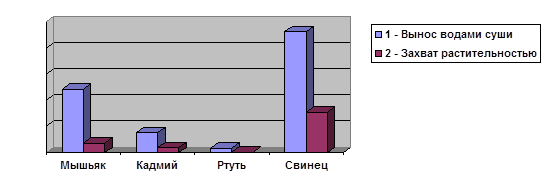 Выброс вредных металлов и их миграция на суши (в тыс. тон в год):