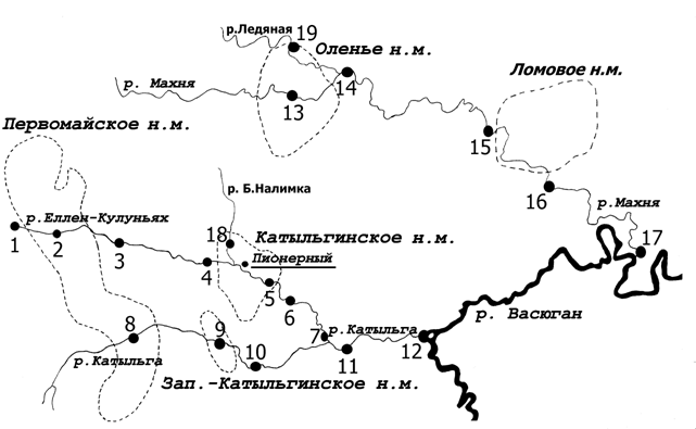 Материалы представленные в данной работе являются результатом мониторинговых гидробиологических исследований притоков р. Васюган (рр. Махня, Катыльга, Еллен-Кулуньях и др.), протекающих по территории основных нефтяных месторождений НГДУ "Васюганнефть" (Первомайское, Оленье, Ломовое, Катыльгинскре, Западно-Катыльгинское) в летние месяцы с 1993 по 1998 гг. (рис).